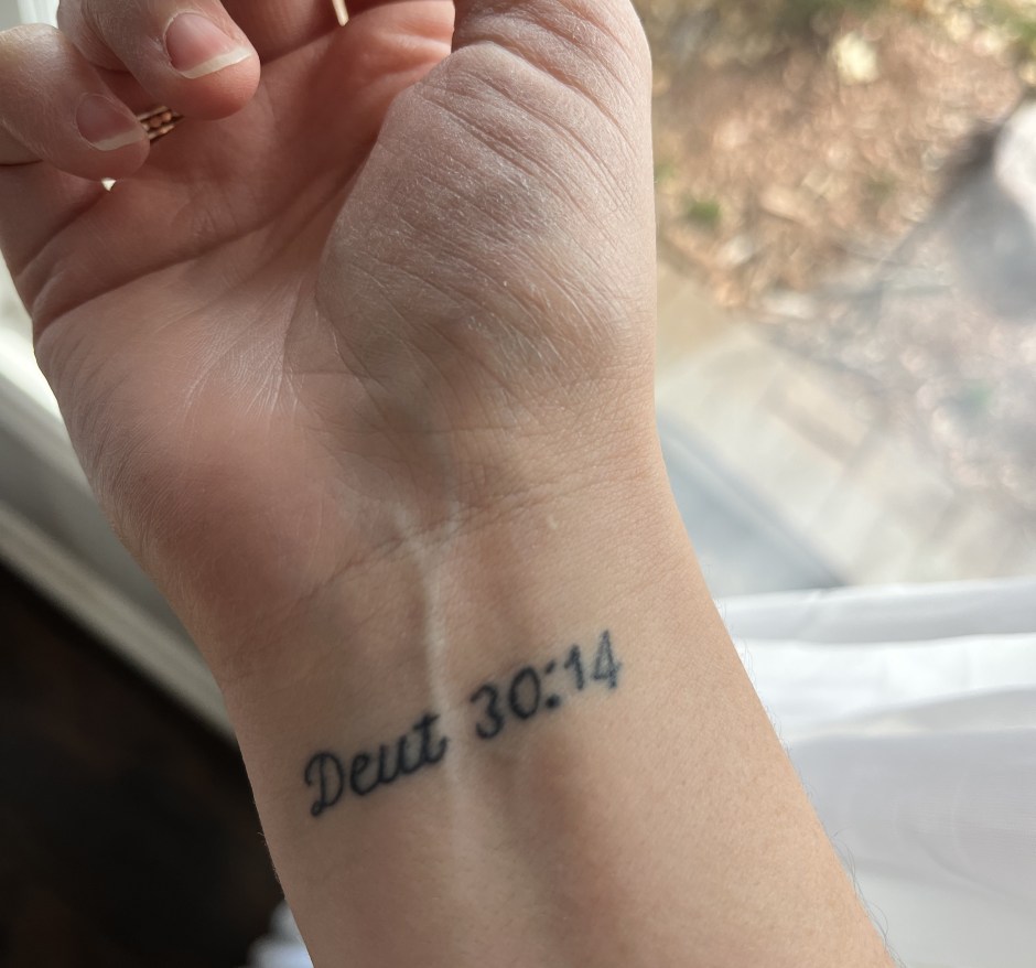 I have a tattoo. I don’t think I’ve shared that here. It’s on my wrist, as you can see, and it references Deuteronomy 30:14. Last summer, Deuteronomy 30:10-14 was the First Reading one Sunday. On that day, I felt these words of Scripture pierce my heart in a way I never had before. This is the passage in full: