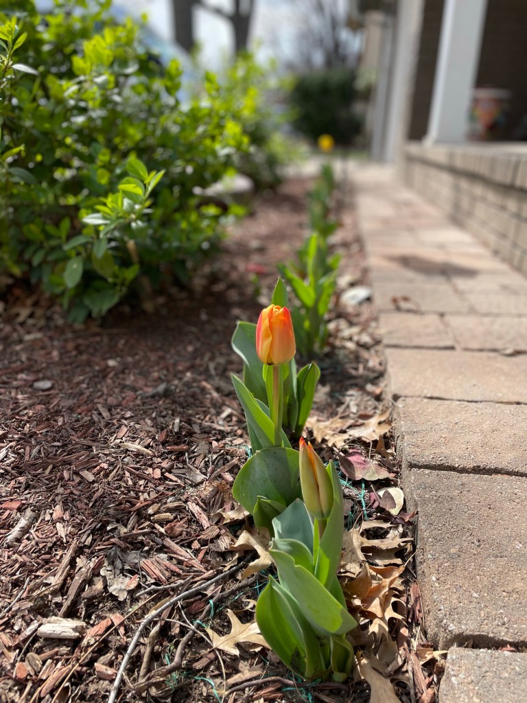 We moved to Kansas in the middle of winter. We had no idea what flowers were going to be in our front or back beds. Would we have a bunch of weeds? Nothing at all? A bunch of perennials? Around both large trees in the front was a very tangled underbrush type of plant. I was thoroughly surprised and delighted by the tulips that came up in early spring.