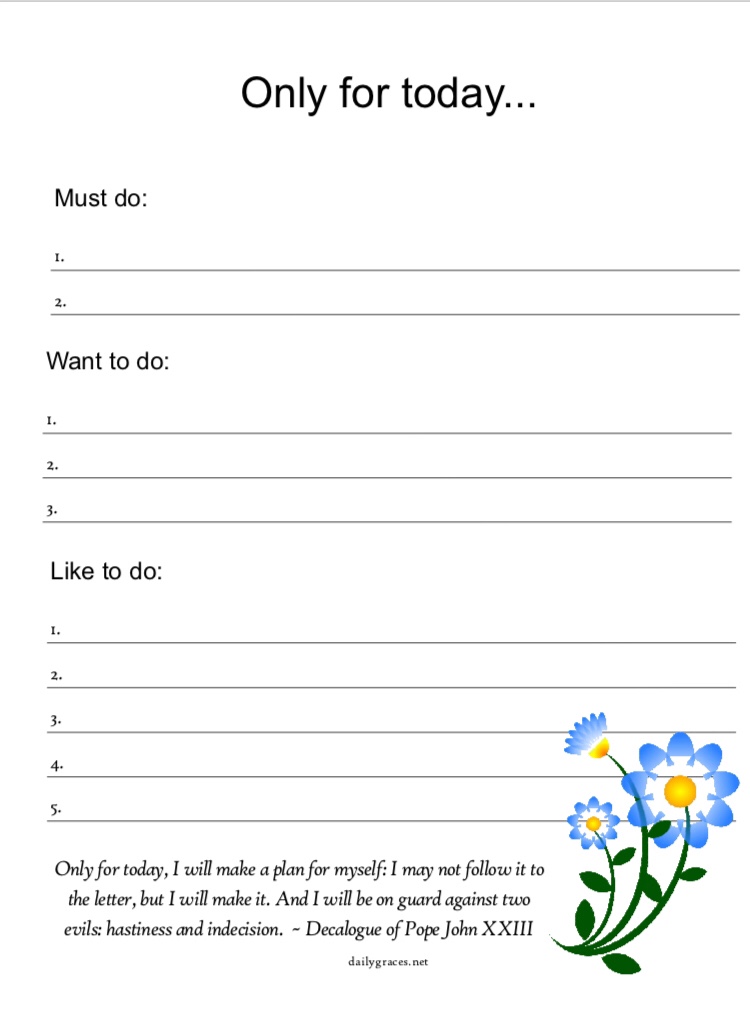 A recent addition to my planning is a simple sheet of paper which I laminated so I can use dry erase markers on it. It says “Only for Today” at the top and is inspired by the Decalogue point above. It has space for 3 kinds of tasks: “must do”, “want to do” and “like to do”. I only allowed myself space for 2 “must do-s”. 3 for “want to do” and 5 “like to do.”